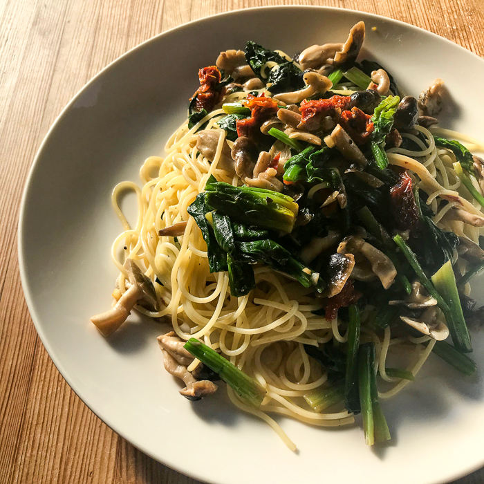 ホウレンソウが好きなのでよく食べているパスタ。ただし、夏はホウレンソウがうまくないので作らない。寒い冬のホウレンソウがうまいのでしょっちゅう食べる。ドライトマトは乾物で常備してるし、ホウレンソウとシメジは使う目的が決まってなくても数日は持つので、安売りを見たら買って冷蔵庫に常備している。だから、何を作るか迷ったときに、このパスタなら材料が揃っているので、よく作ることになるわけ。