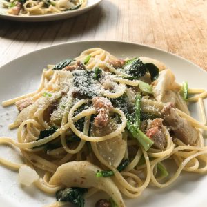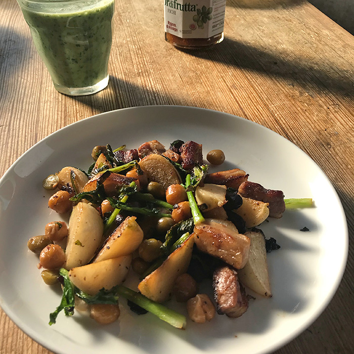 塩をして冷蔵保存している豚バラ肉ブロックを使った炒め物。豚バラ肉は基本的に野菜と一緒に炒めているが、カブもよく合う野菜の一つ。今回はカブの量が少なかったので、缶詰のミックスビーンズを加えた。いい組み合わせだった。